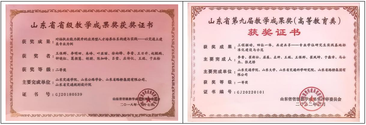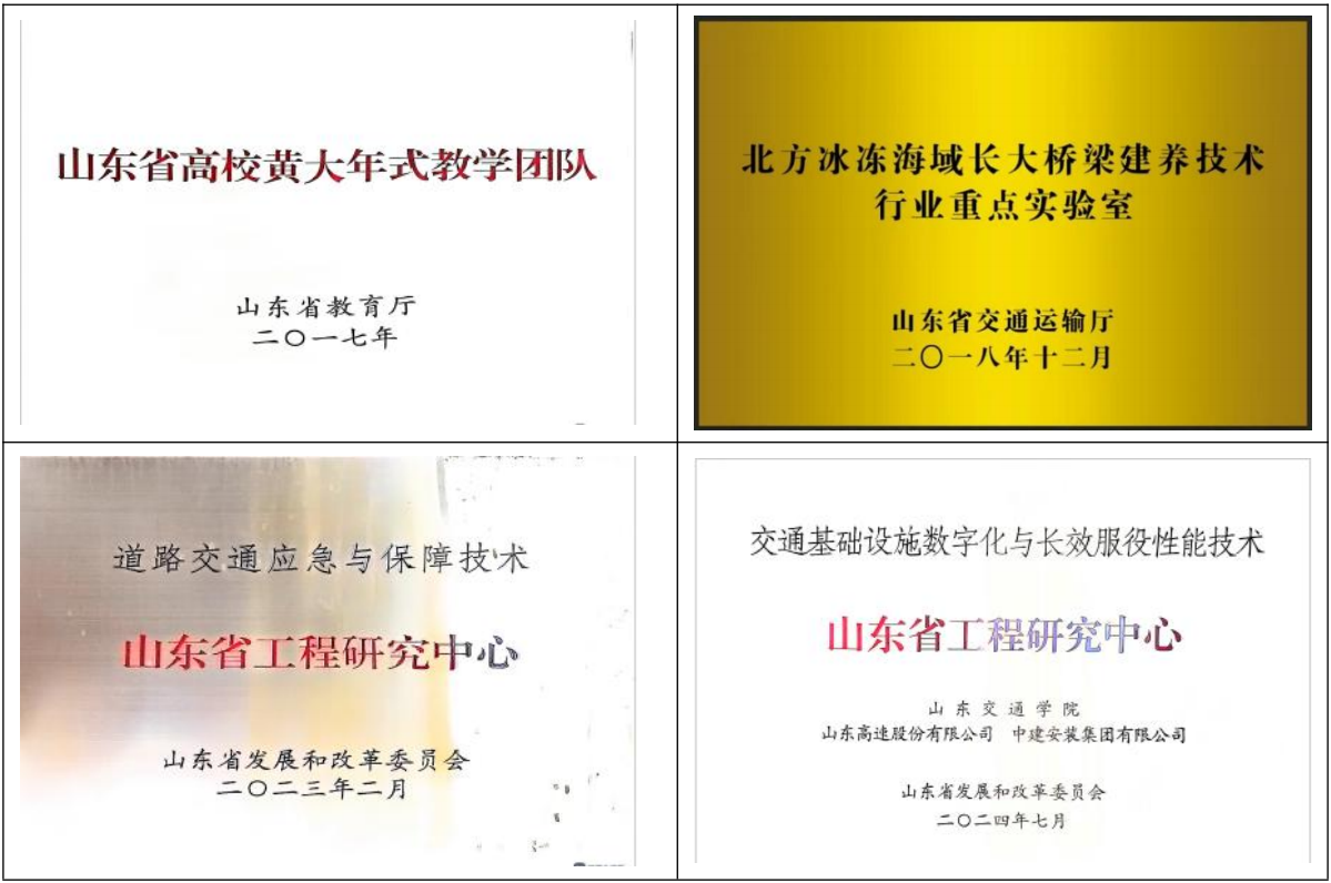 tyc7111cc太阳成集团教师团队为山东省高校“黄大年”式教学团队,交通土建工程教学团队、涉外工程双语教学团队为山东省教学团队;道路交通应急保障技术研究团队为山东省高等学校优势学科人才团队,桥梁与隧道防灾减灾技术创新团队为山东省高等学校青创人才团队。