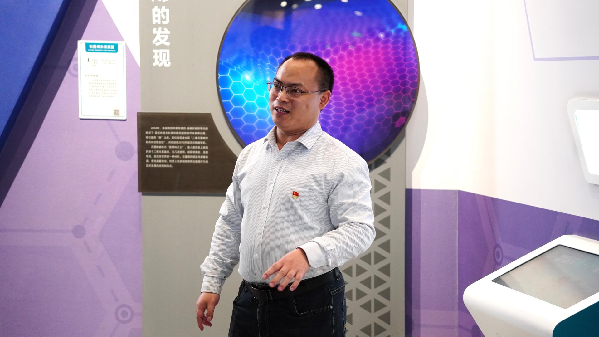 在材料科技展区,教工第六党支部书记刘小村结合“石墨烯的发现”展位,给学生第八党支部学生党员上了一堂以“材料古与今”为主题的“科技创新微党课”。把课堂带到科技最前沿,把课程思政带到“看得见摸得着”的一件件材料科技展品前。他从侯德榜突破制碱技术封锁事迹,到碳吸收混凝土实现铺装道路“呼吸”功能的未来技术,再到讲述具有科技报国精神的共产党员攻坚克难关的奋斗事迹。带领党员们回溯了新中国材料科学发展史,拓宽了材料专业前沿知识,感悟了科学家精神的内涵。让参与活动的党员增强了科技强国的使命感,更坚定了学好专业知识的信心。