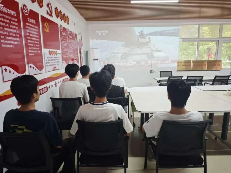 学生干部及入党积极分子代表在一站式学生社区集中观看阅兵活动。其余学生在宿舍、教室、实习单位同步收看并参与交流讨论。