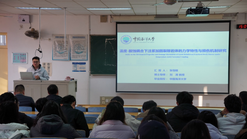 张恒根老师聚焦具体研究前沿,作了《温度-酸蚀耦合下注浆加固裂隙岩体的力学特性与损伤机制研究》的专题学术报告,报告深入探讨了复杂环境下岩体工程的注浆加固机理与性能演化,不仅展示了一项严谨的科学研究范式,也为在场同学揭示了交通土建领域内重要的研究方向与创新切入点。本次论坛内容充实,兼顾了宏观的科研方法论与微观的专题研究深度,学术氛围浓厚。