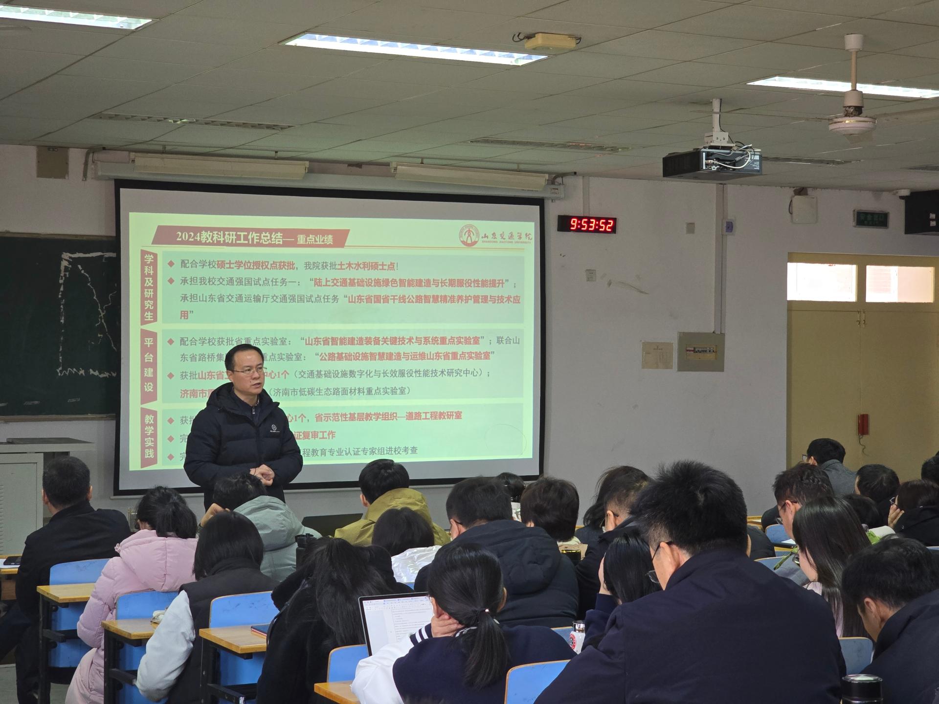 滕怀国传达了学校2025年春季学期干部学习和工作研讨班精神,结合学院实际情况,对进一步提升人才培养质量、加强学科建设和师资队伍建设、全面提高社会服务能力等工作进行了部署,并对如何落实好学校“改革创新提升年”的各项任务指出了努力方向。他强调,全院教职工要按照学校要求,正视发展过程中面临的新形势、新问题,主动融入新赛道、适应新要求,强化担当意识,团结奋斗,努力推动学院事业高质量发展。滕怀国还为全体教师上“开学第一课”。