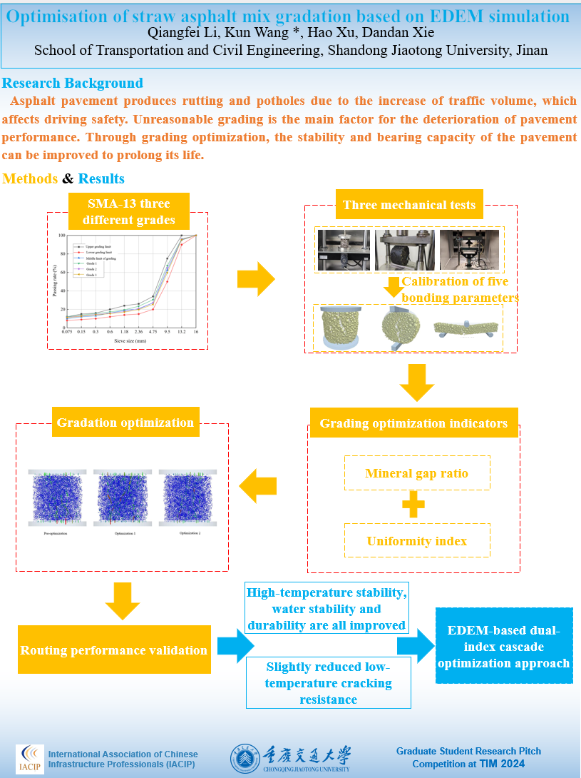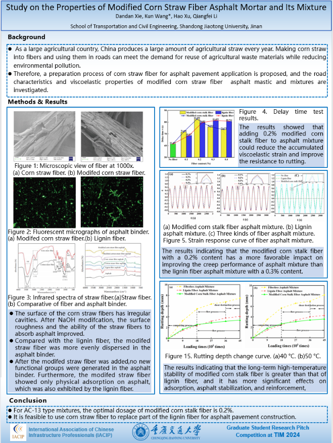 我校tyc7111cc太阳成集团研究生一年级学生李强飞、谢丹丹同学在本次TIM会议投稿并参加了全英文论文演讲,题目为《Optimization of straw asphalt mix gradation based on EDEM simulation》、《Study on the Properties of Modified Corn Straw Fiber Asphalt Mortar and Its Mixture》同时做英文海报展示并与国内外行业专家进行了海报讨论,论文和演讲均获得三等奖的优异成绩。据悉自同济大学、东南大学、西南大学等知名高校共计70多位研究生参加了本次比赛。
