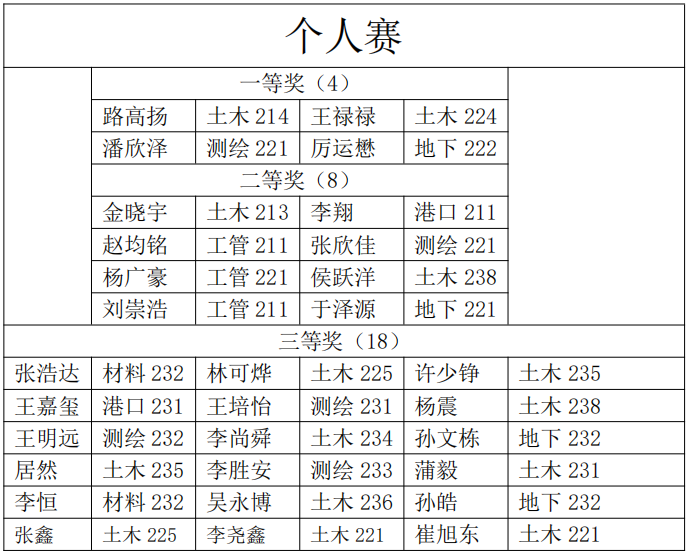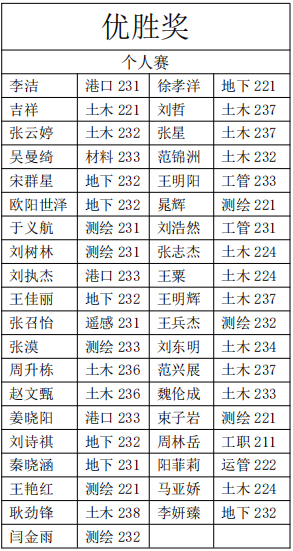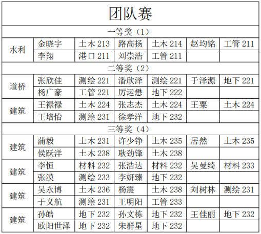 本次比赛全校共有110人、12个团队报名,经过专家严格评审,最终评选出团体一等奖1项、二等奖2项、三等奖4项;个人一等奖4项,二等奖8项,三等奖18项,优胜奖若干。