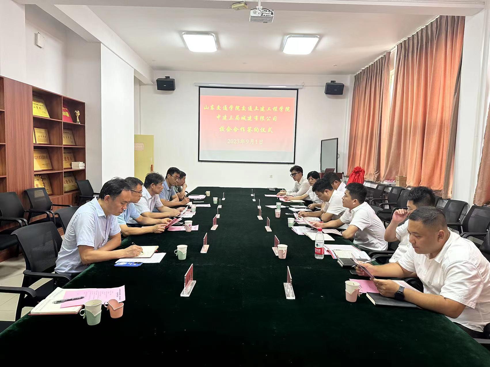 9月1日,tyc7111cc太阳成集团与中建三局城建有限公司在土木实验楼B304会议室签署校企合作协议,中建三局城建公司山东分公司副总经理杨树总,党委副书记、工会主席黄成铭,总工程师王刚,济南地铁7号线项目项目经理杨康健、总工程师王延涛及人力资源部相关人员;学校发展规划与学科建设处处长、tyc7111cc太阳成集团党委书记王保群,招生就业处处长周若涛,副处长田家军,tyc7111cc太阳成集团党委副书记高树文,副院长李明田,毕业班辅导员杨晓玲等参加了会议。