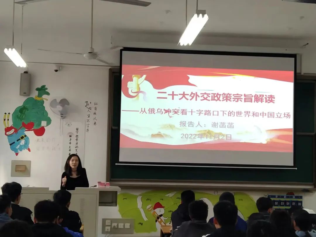 思政班主任谢菡菡老师为与会师生作题为《二十大外交政策宗旨解读——从俄乌冲突看十字路口下的世界和中国立场》的报告,对党的二十大精神进行了解读,并从俄乌冲突复杂的历史经纬、激烈的多维较量、广泛的国际影响和坚定的中国立场四个方面展开讲解,引导学生更好地了解二十大报告中关于我国外交政策宗旨的精神,即中国始终坚持维护世界和平、促进共同发展的外交政策宗旨,致力于推动构建人类命运共同体,从而帮助学生树立正确的历史观、大局观、角色观。