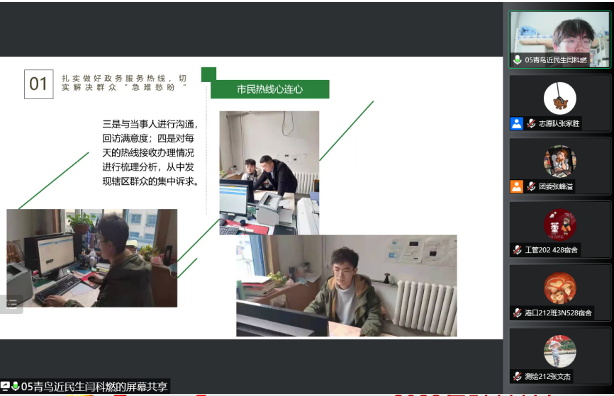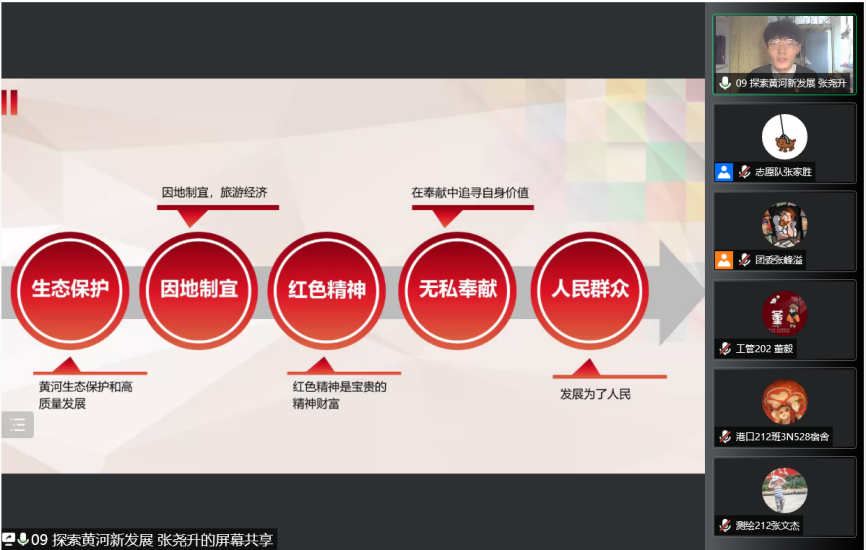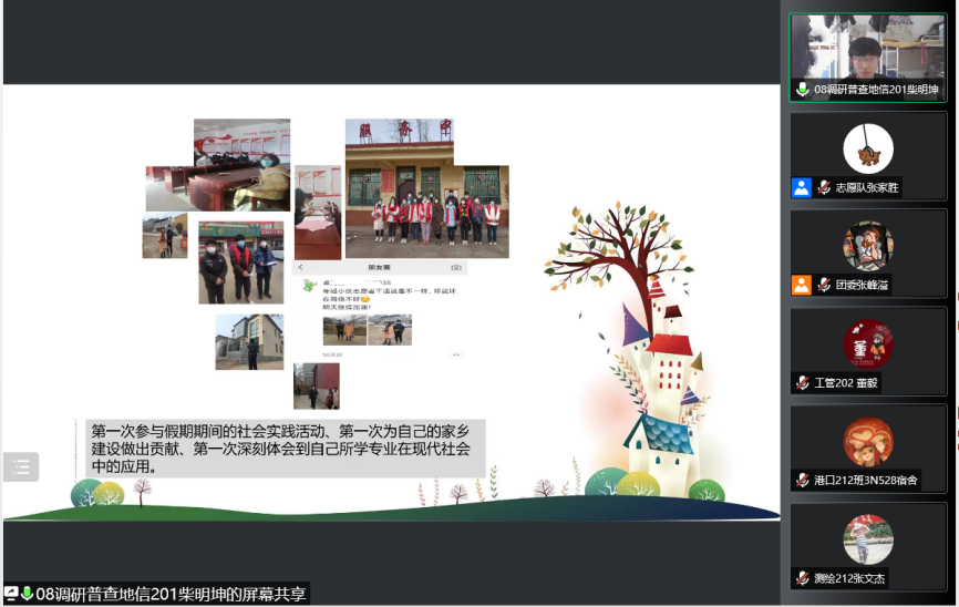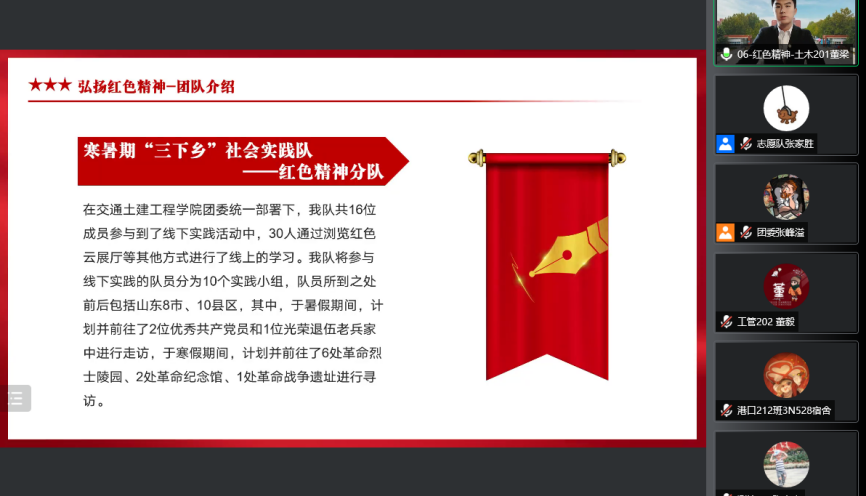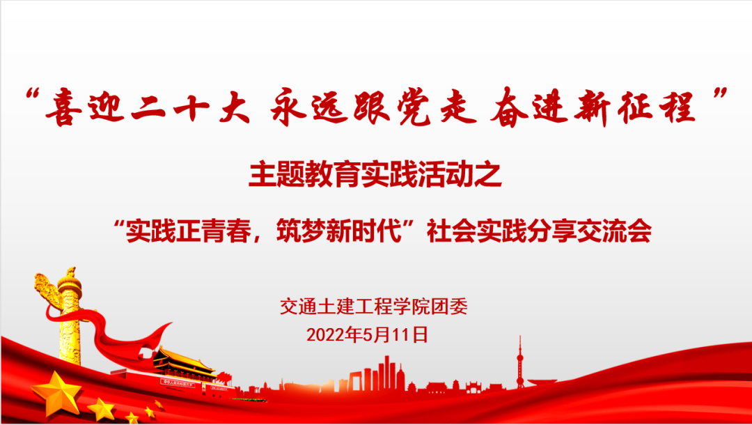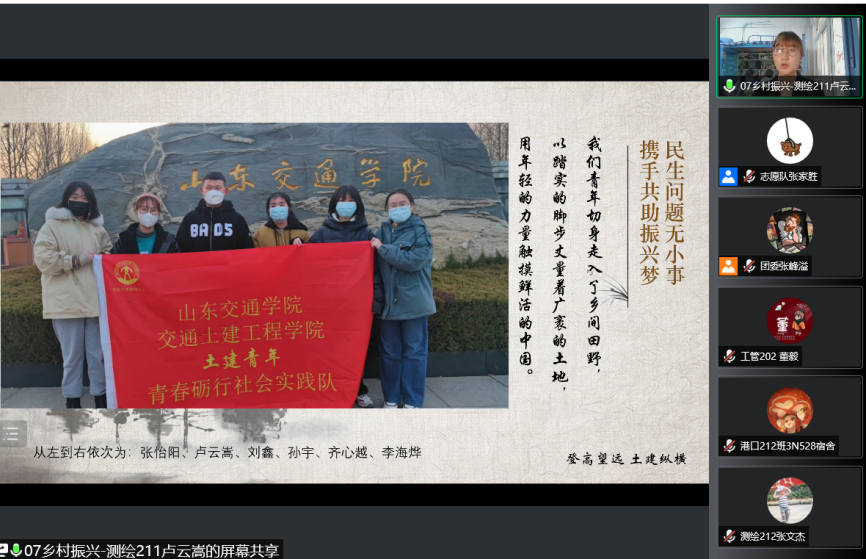 为进一步夯实社会实践成果,广泛交流我院社会实践活动的优秀经验,扩大实践育人的覆盖面和影响力,我院开展了“喜迎二十大 永远跟党走 奋进新征程 ”主题教育实践活动之“实践正青春,筑梦新时代”社会实践分享交流会。本次活动以线上方式进行,学院党委副书记高树文,团委书记宋天娇,辅导员杨晓玲、尹军宗,学院团学骨干代表以及2020级、2021级学生代表参加了本次活动。